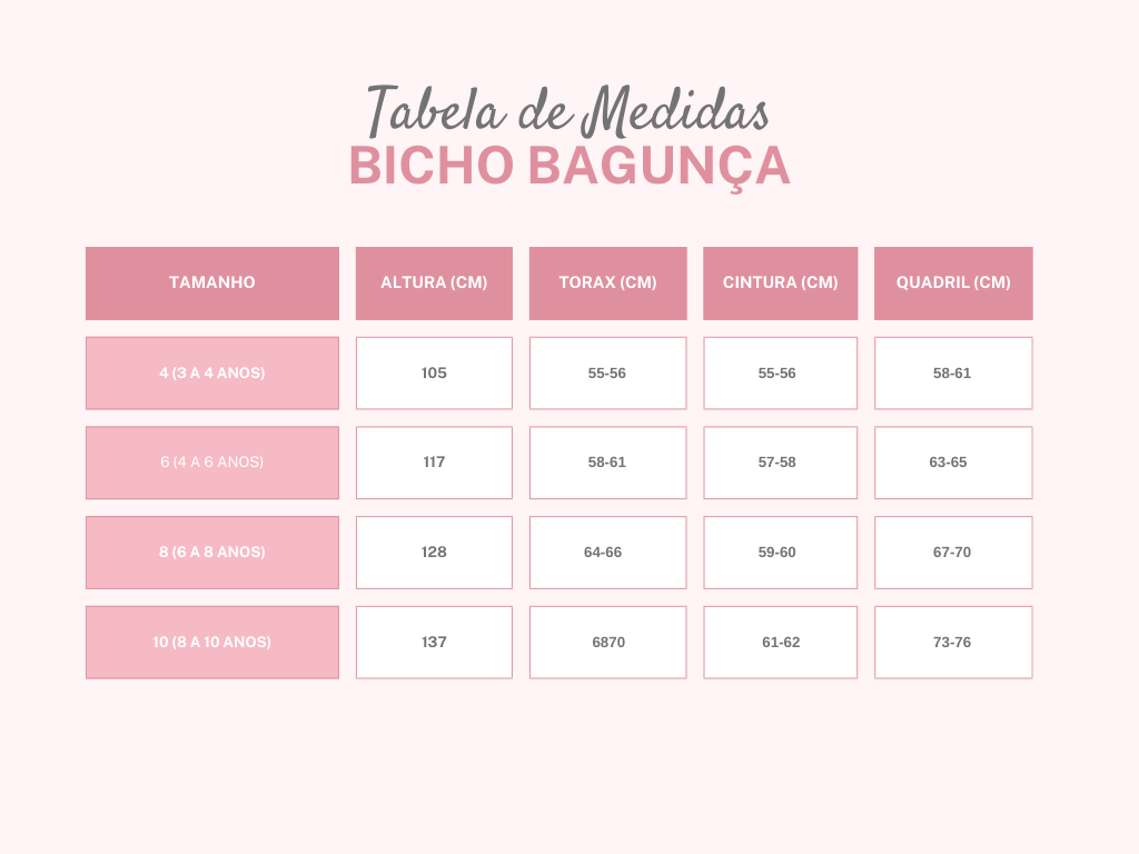 Para garantir a melhor escolha, consulte a tabela de medidas disponível na página de cada produto. Meça a altura, tórax, cintura e quadril e compare com as informações fornecidas. As medidas são informadas em centímetros para maior precisão.