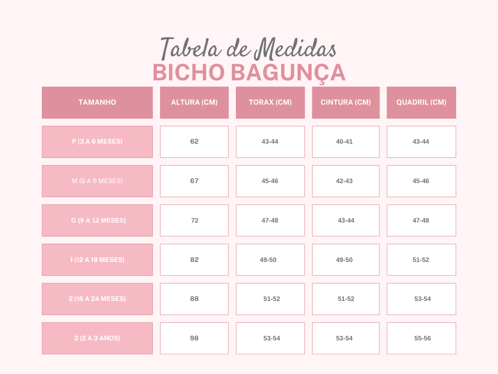 Para garantir a melhor escolha, consulte a tabela de medidas disponível na página de cada produto. Meça a altura, tórax, cintura e quadril e compare com as informações fornecidas. As medidas são informadas em centímetros para maior precisão.