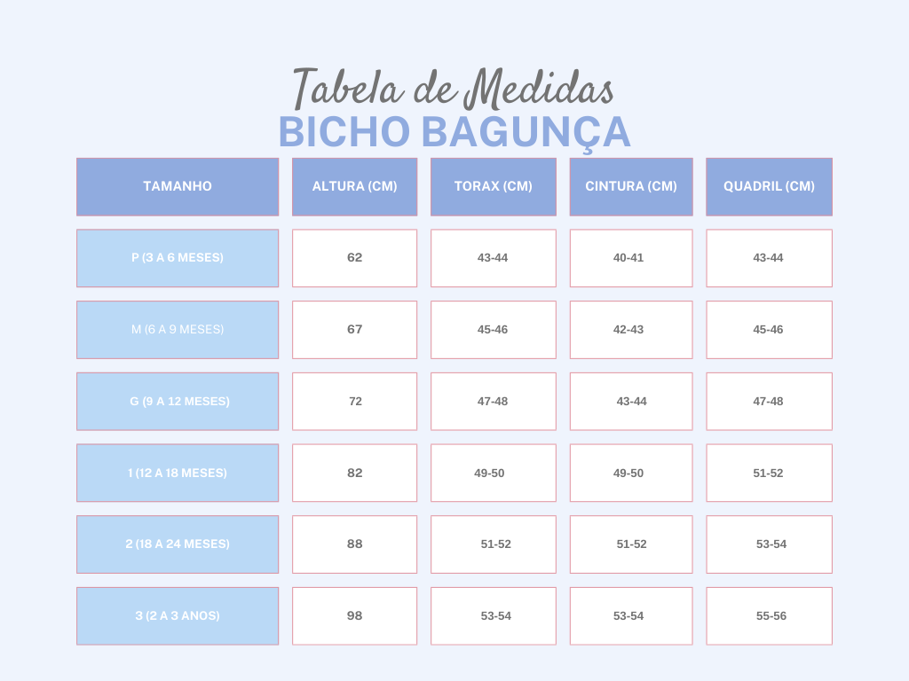 ESSAS MEDIDAS SÃO APROXIMADAS, CADA CRIANÇA TEM TAMANHOS DIFERENTES UMA DAS OUTRAS. SÃO RELATIVAS AS CRIANÇAS, E NÃO AS ROUPAS, SE AS MEDIDAS DAS CRIANÇAS FICAREM ENTRE DOIS TAMANHOS, RECOMENDAMOS ESCOLHER O MAIOR.
